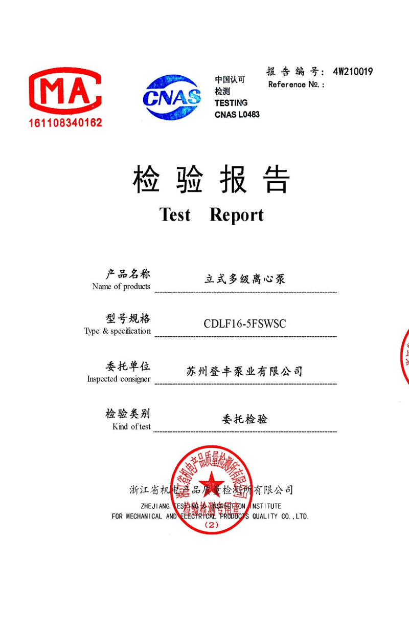 蘇州泵業(yè)立式多級離心泵檢驗報告