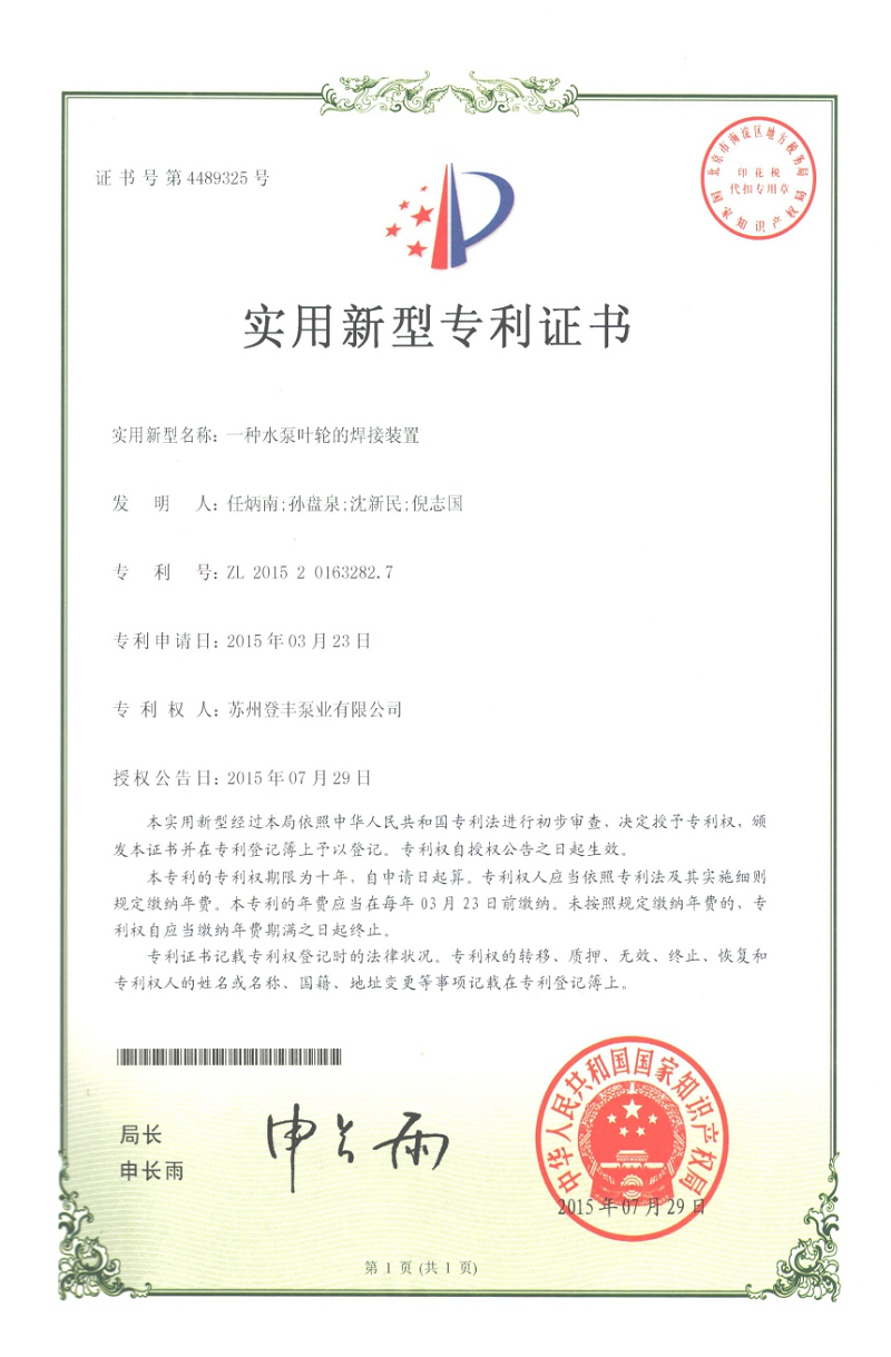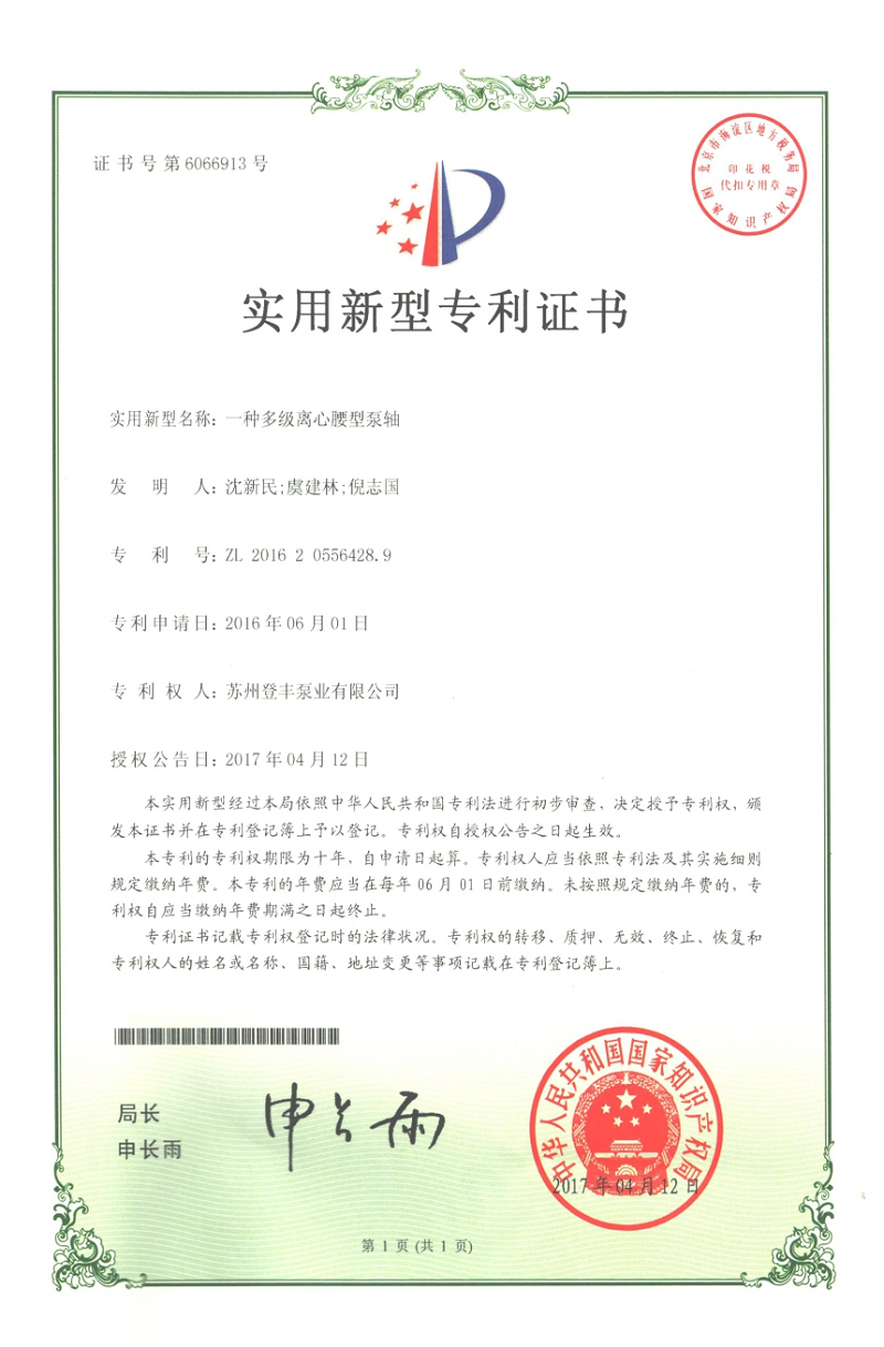 立式多級(jí)離心泵專利證書