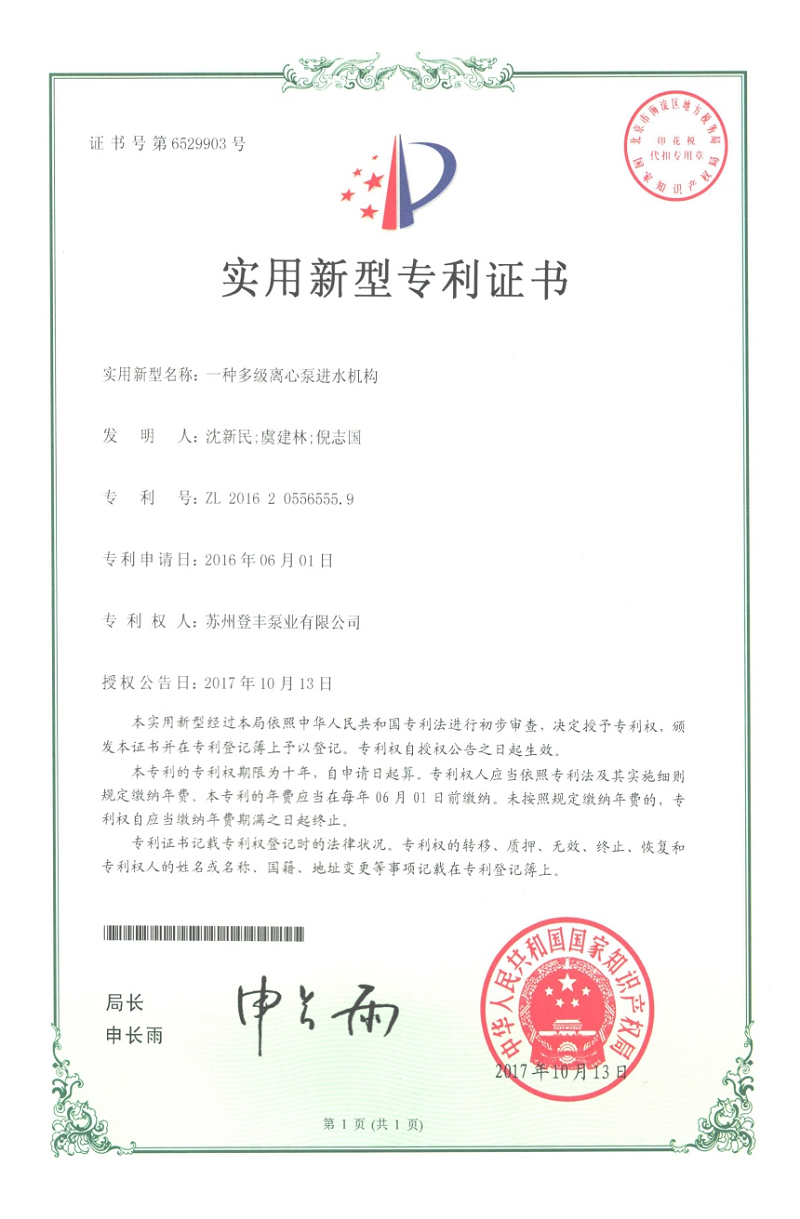 多級(jí)離心泵進(jìn)水機(jī)構(gòu)專利證書
